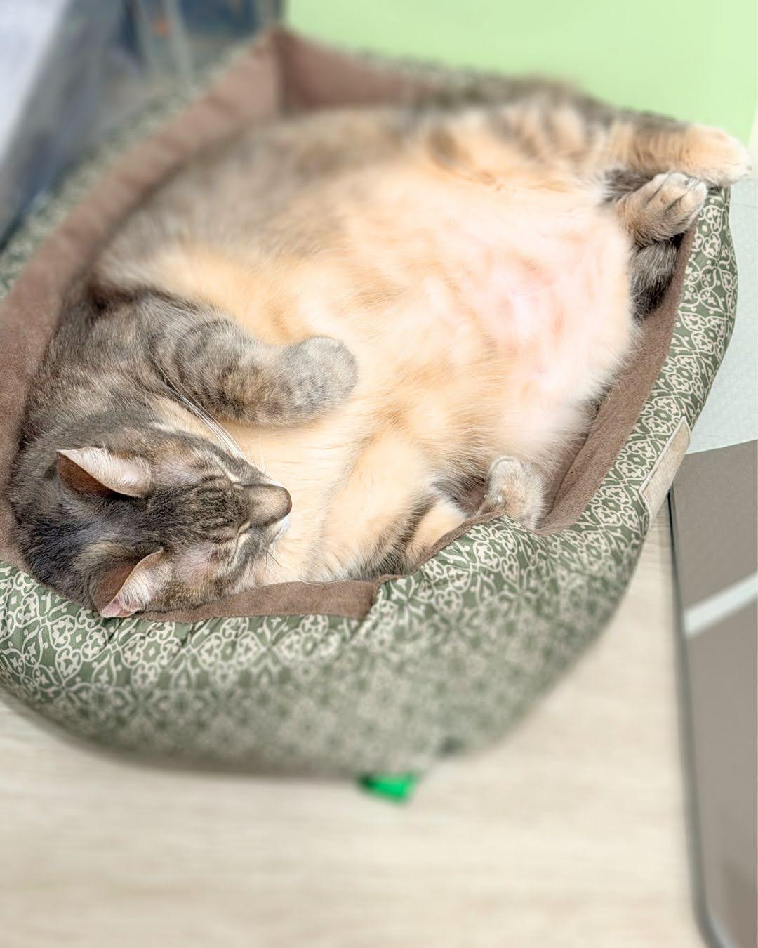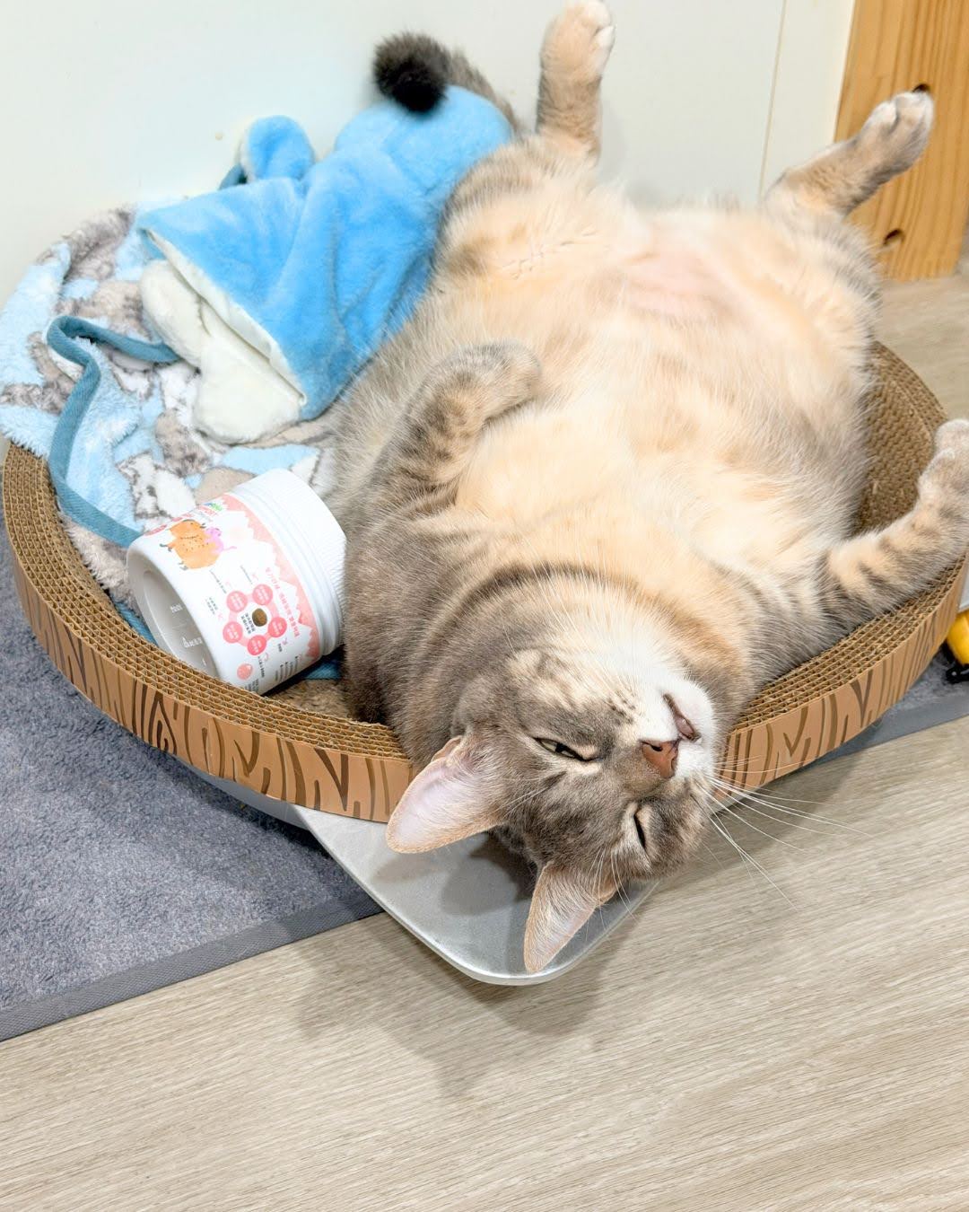LuLu 平常超黏人,我常笑她是「恐怖情人」型(又兇又恰又愛跟)。這陣子因為我常常早出晚歸,有時甚至好幾天不在家,擔心她焦慮不安。這款安撫情緒、舒緩壓力的產品含有專利 GABAbiotics,能幫助減少焦慮、提升睡眠品質。吃了一週之後,晚上看到她睡到「四腳朝天翻肚」的模樣,就覺得好安心。