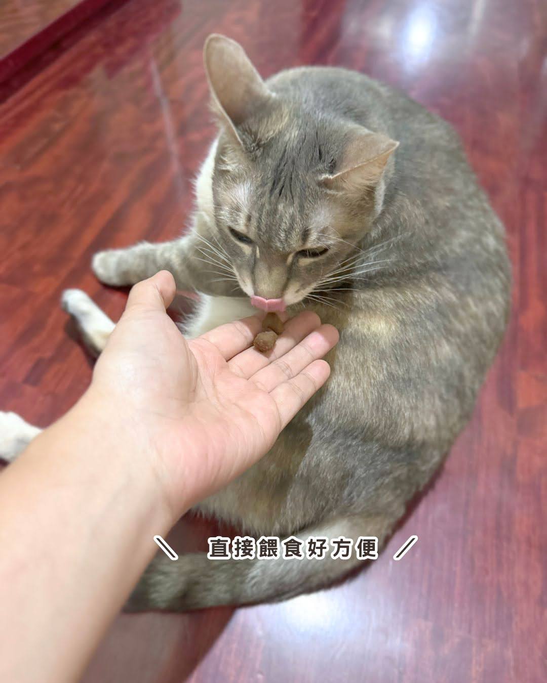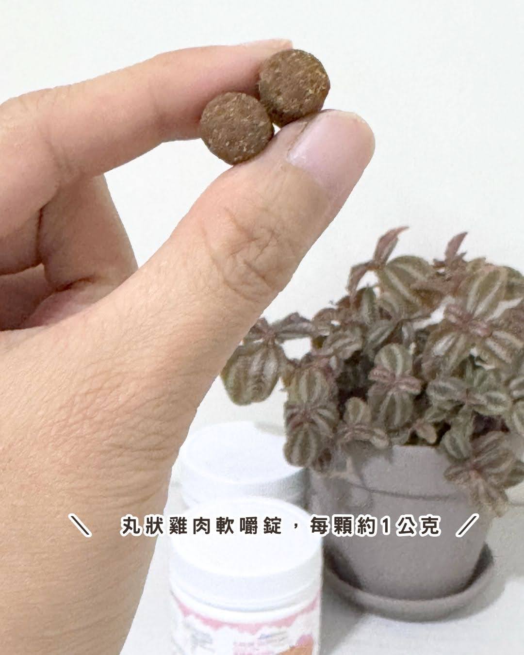 每罐 90g,共 90 顆丸狀雞肉軟嚼錠(每顆約 1g),適口性高、餵食方便。6 個月以上貓咪每天可吃 2 顆(早晚各 1 顆)。我習慣在下午茶時間把錠放進碗裡當小點心,偶爾會捏碎拌在乾乾上。