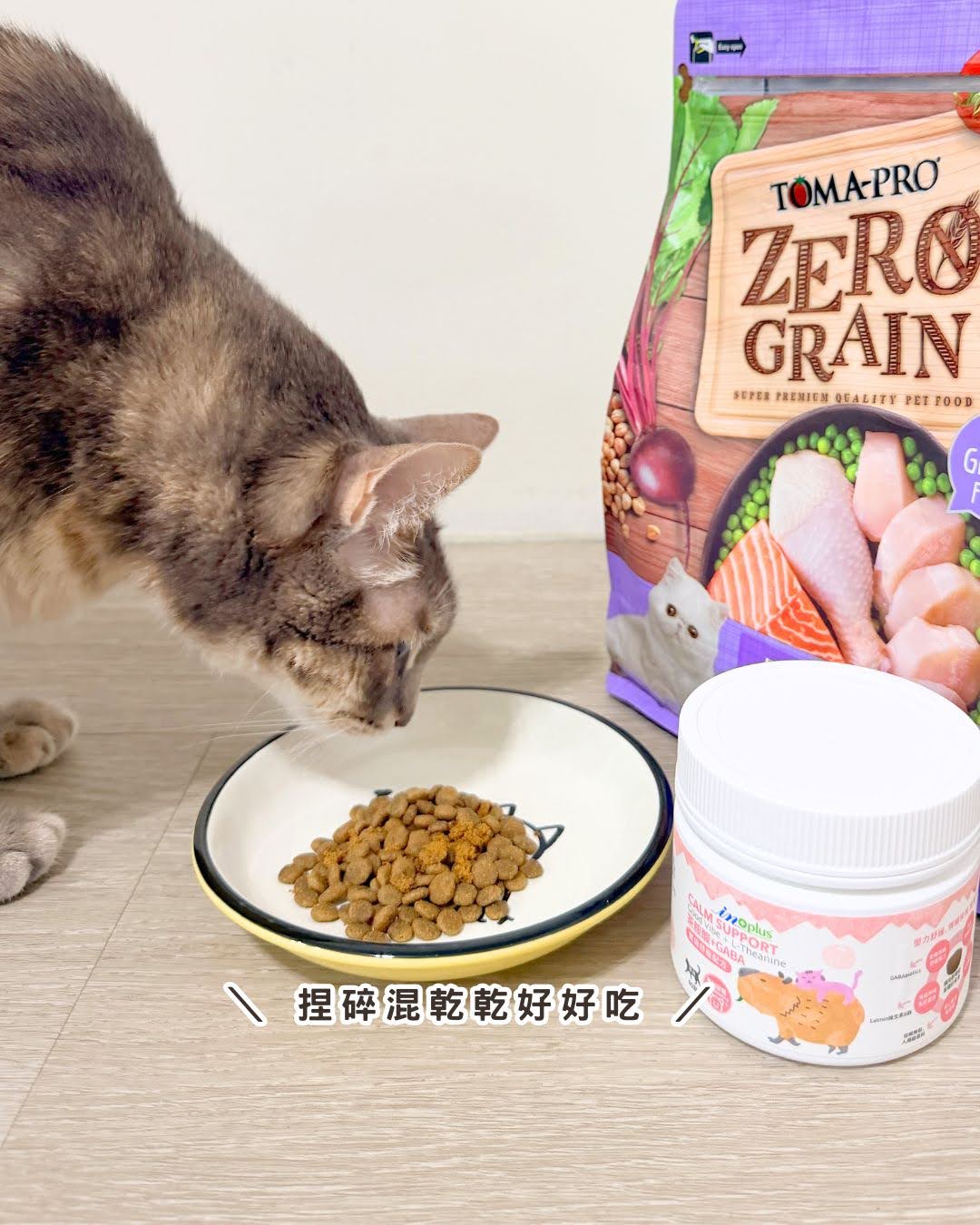 飲食方面,除了木天蓼或貓草排毛粉,我過去很少給她專門的「舒壓保健品」。直到最近 LuLu 愛用的保健食品品牌 IN-Plus 推出新品《茶胺酸+GABA 雙倍舒壓配方(貓用)》,才讓她試試。