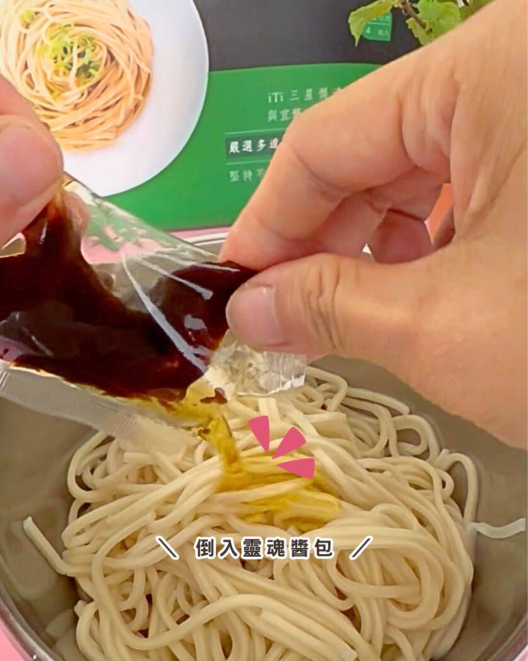 靈魂在這包〈蒜香三星蔥苦茶油醬包〉——拌進剛起鍋的麵裡,香氣立刻撲鼻而來,連小貓咪LuLu都忍不住跳上桌子想要吃上一口。