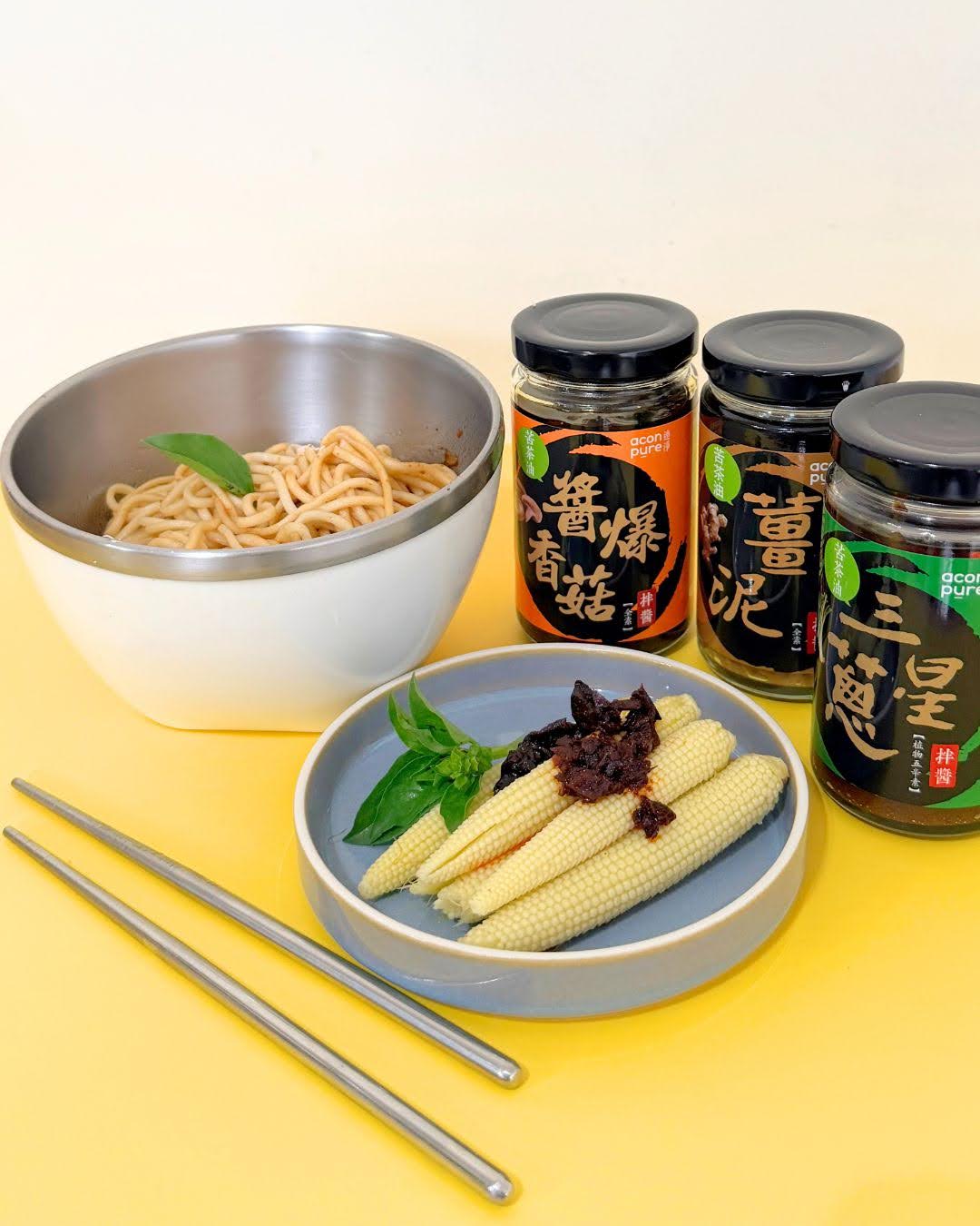 午餐想吃點青菜,我直接把蒸好的玉米筍淋上〈醬爆香菇拌醬〉,簡單又美味。