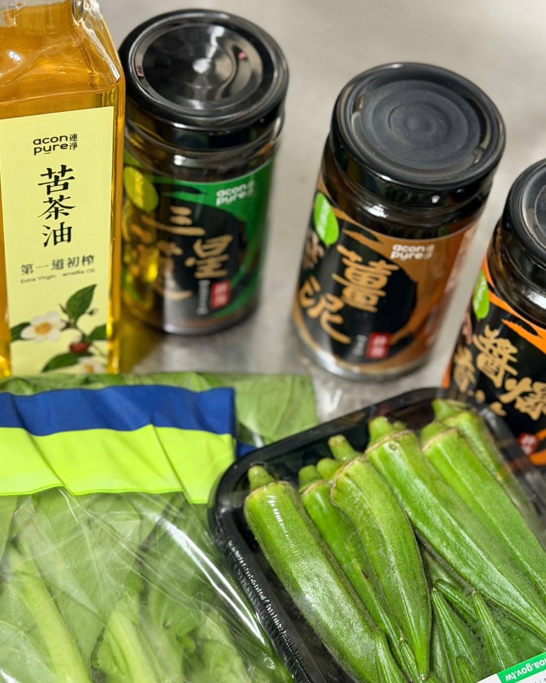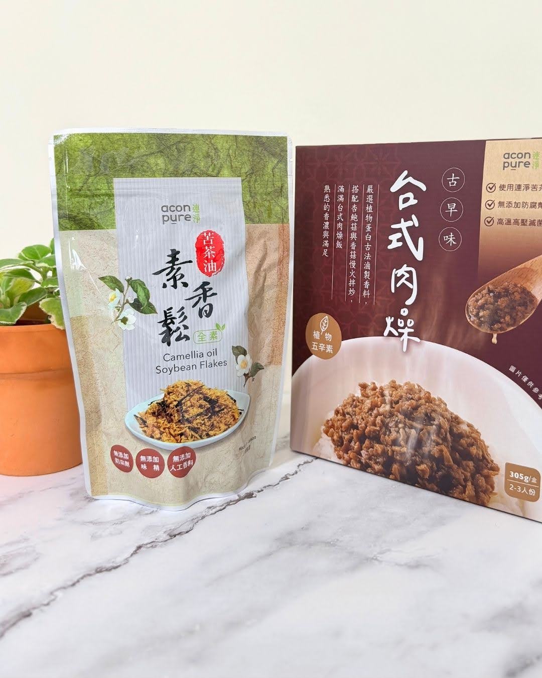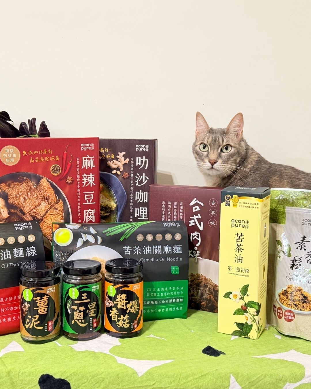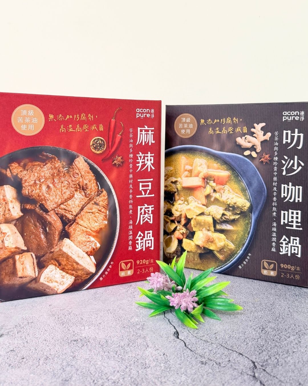 連淨苦茶油本尊、連淨苦茶油麵線、苦茶油薑泥拌醬、苦茶油三星蔥拌醬、苦茶油醬爆香菇拌醬、麻辣豆腐鍋、叻沙咖哩鍋、苦茶油素香鬆、古早味台式肉燥……通通都是用自家苦茶油製作的。還有區分純素和植物五辛素,我有時配合週一無肉日也能健康吃。