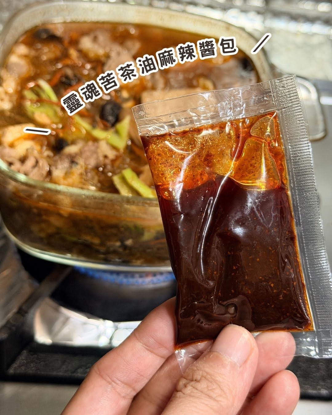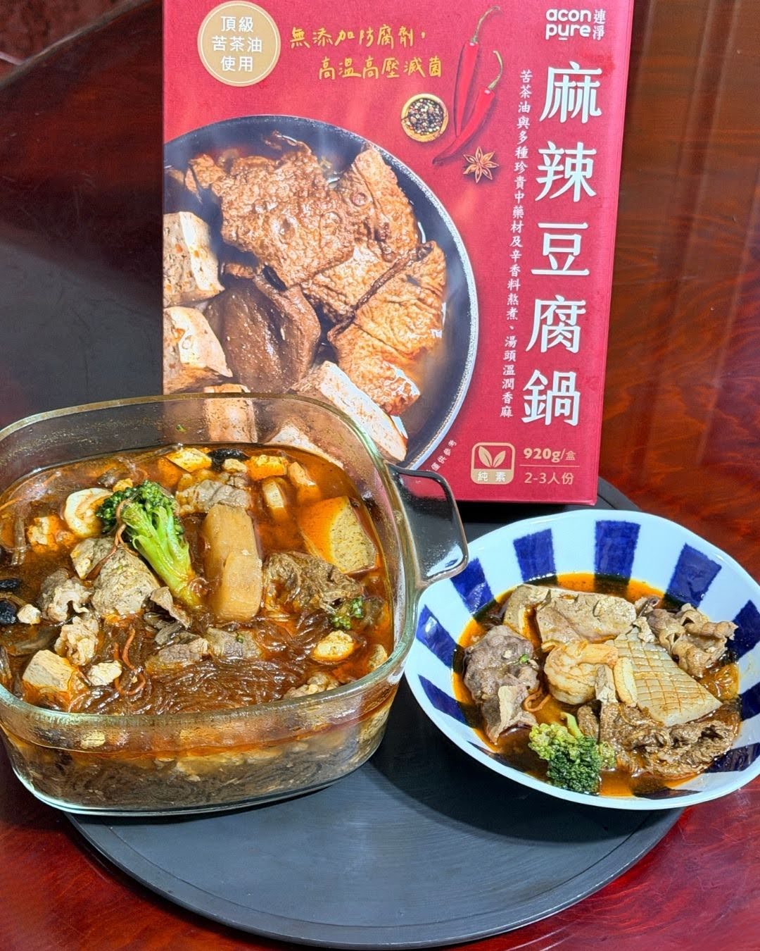 我加了牛肉片、大蝦仁、蟹腳、花椰菜和粉絲煮成海陸版,關火前再加入四分之一包〈苦茶油麻辣醬包〉,用苦茶油跟多種珍貴中藥材、辛香料熬煮的湯頭溫潤、香麻不嗆,喝一口整個人都暖了起來。