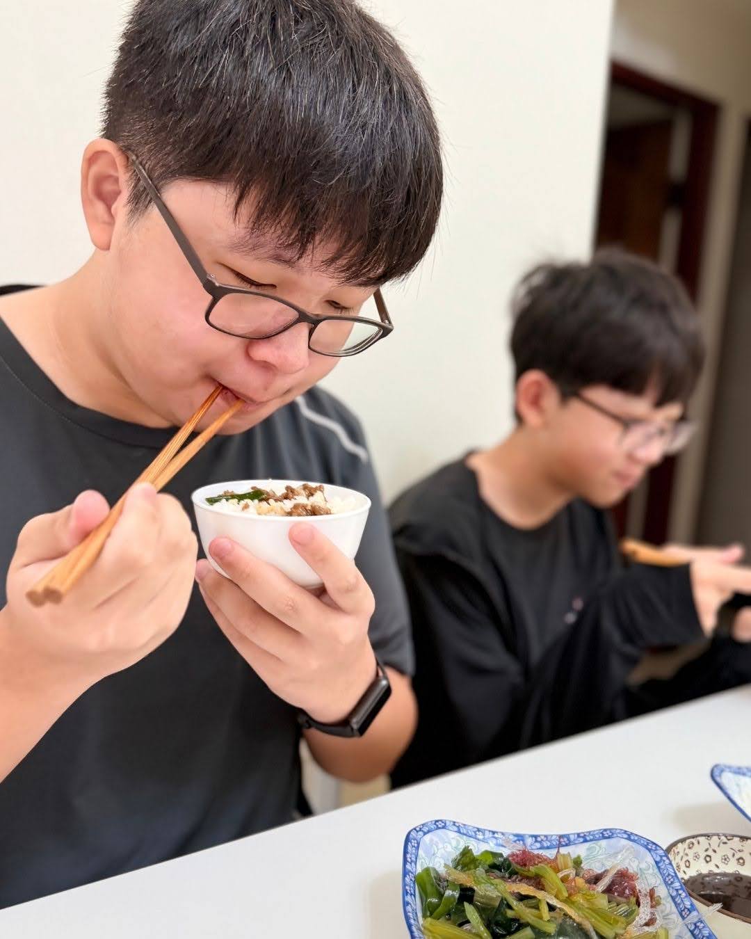 鍋中先倒入苦茶油,打開料理包加熱拌炒,三分鐘就能上桌。午餐吃烤鴨配肉燥飯,大葛格一口氣吃了兩碗肉燥飯,更讓他驚訝的是——這是有添加杏鮑菇的素肉燥!早知道我應該再燙個青菜拌肉燥,讓這些肉食男孩多吃點菜。