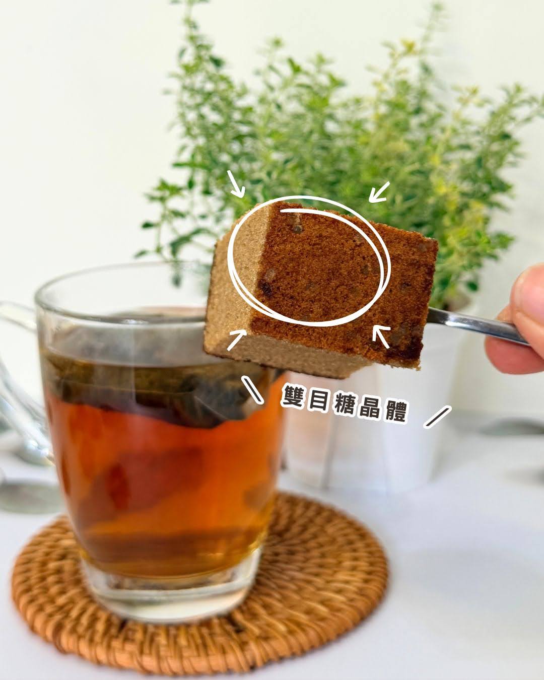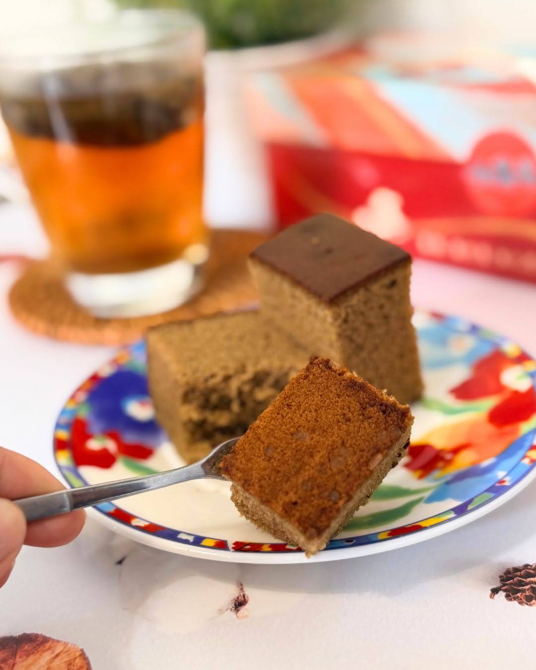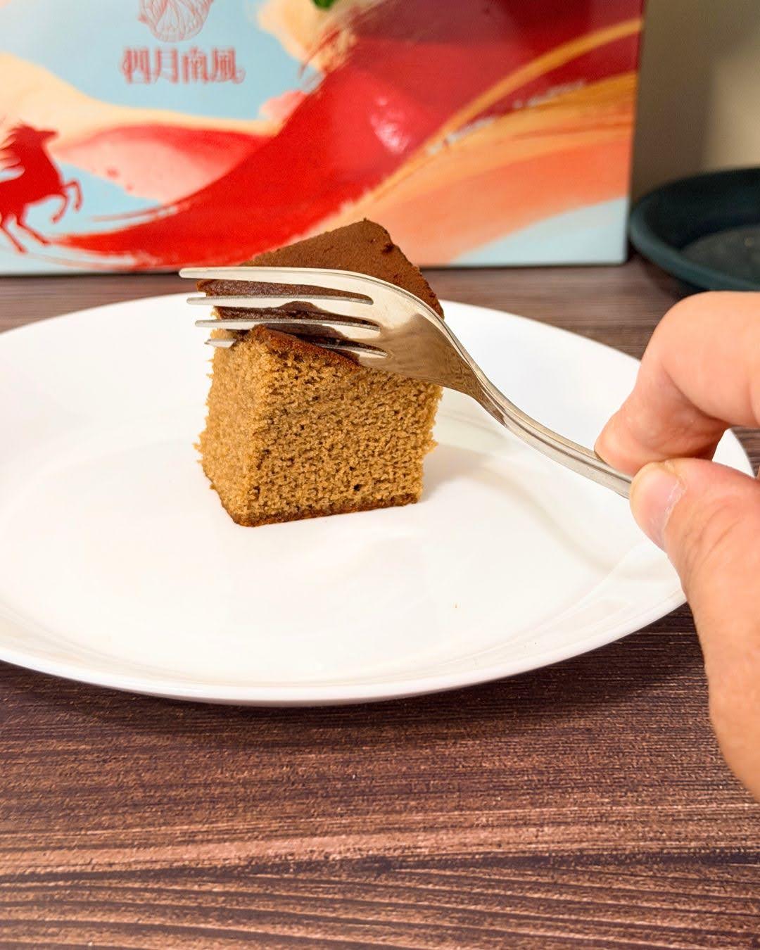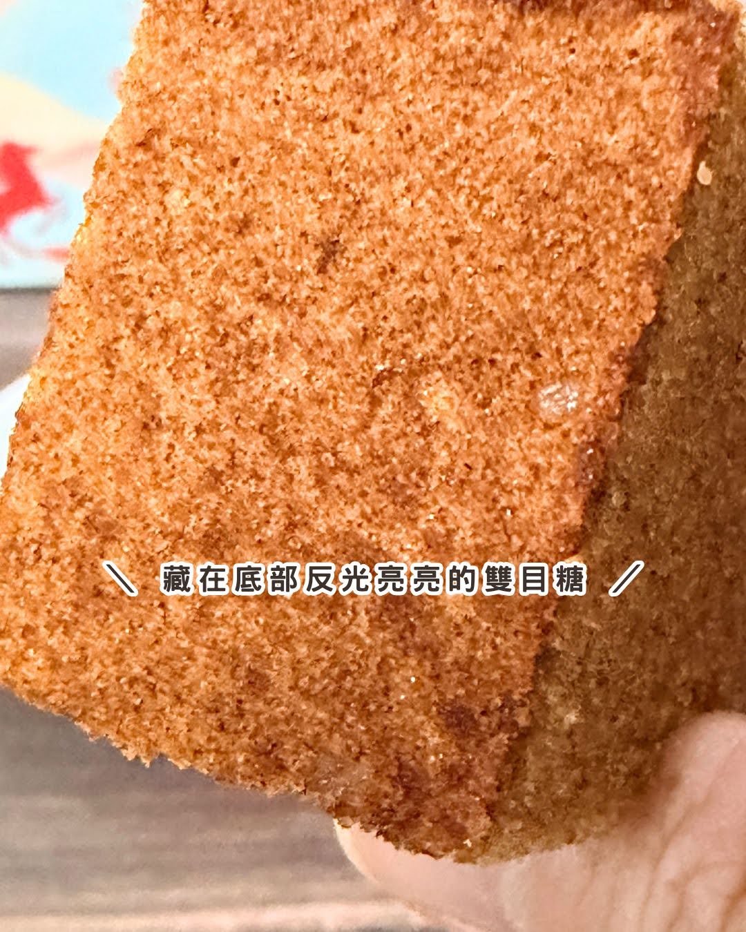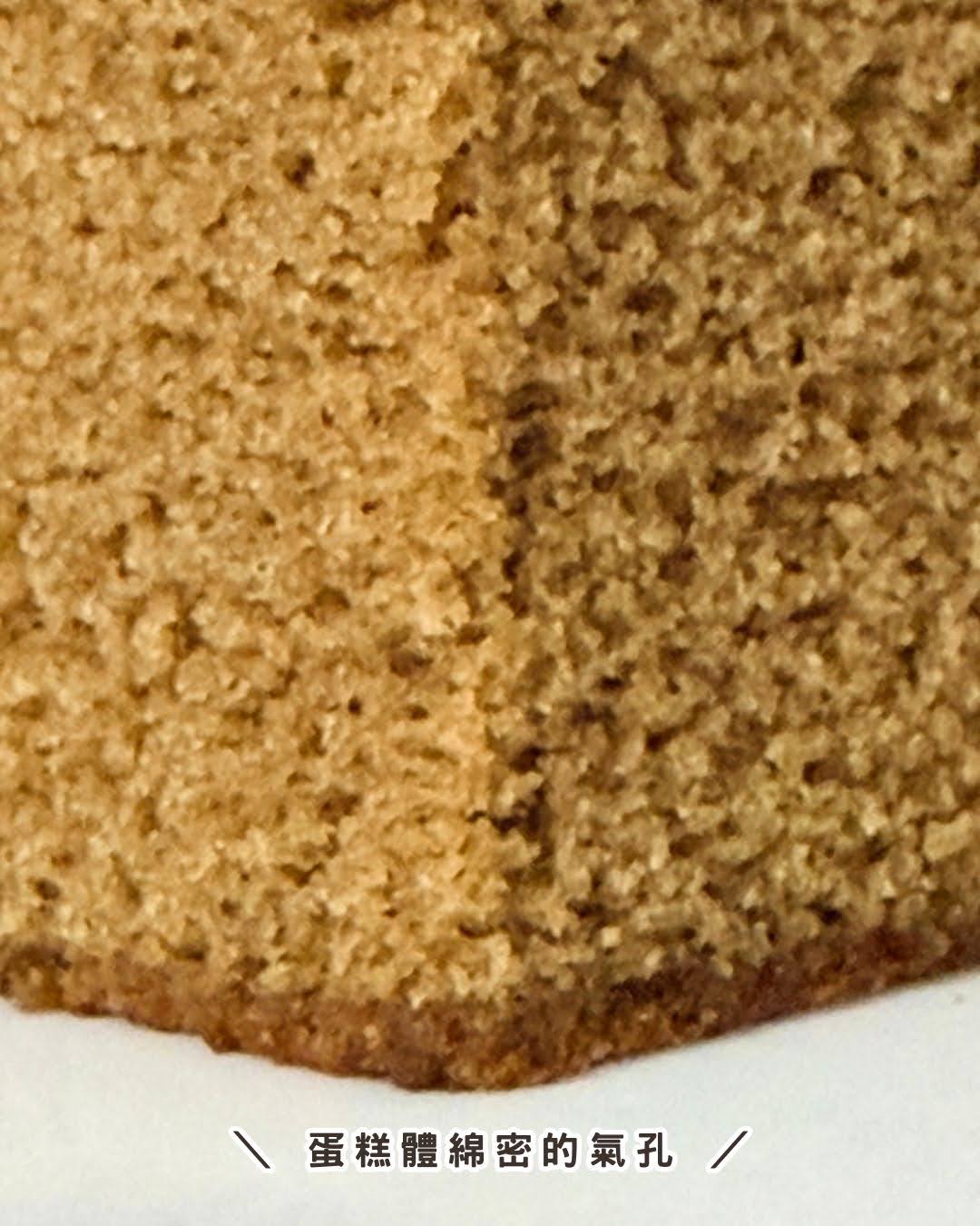 拿起一塊細細品嚐——雖然沒有加蜂蜜,卻散發出蜜糖般的甜香。蛋糕體氣孔細緻綿密,口感有點像黑糖糕的Q彈,入口層次分明。與一般蜂蜜蛋糕不同,它完全不會有需要配水才能吞嚥的乾澀感。更驚喜的是,伯爵茶粉的優雅香氣讓蛋糕更添深度,底層還能咬到晶脆的雙目糖。雖然因為離開冷藏時間稍久,糖粒部分已微微融化,被蛋糕邊緣吸收並與茶香融合,但仍保有細緻的顆粒口感,別有一番風味。