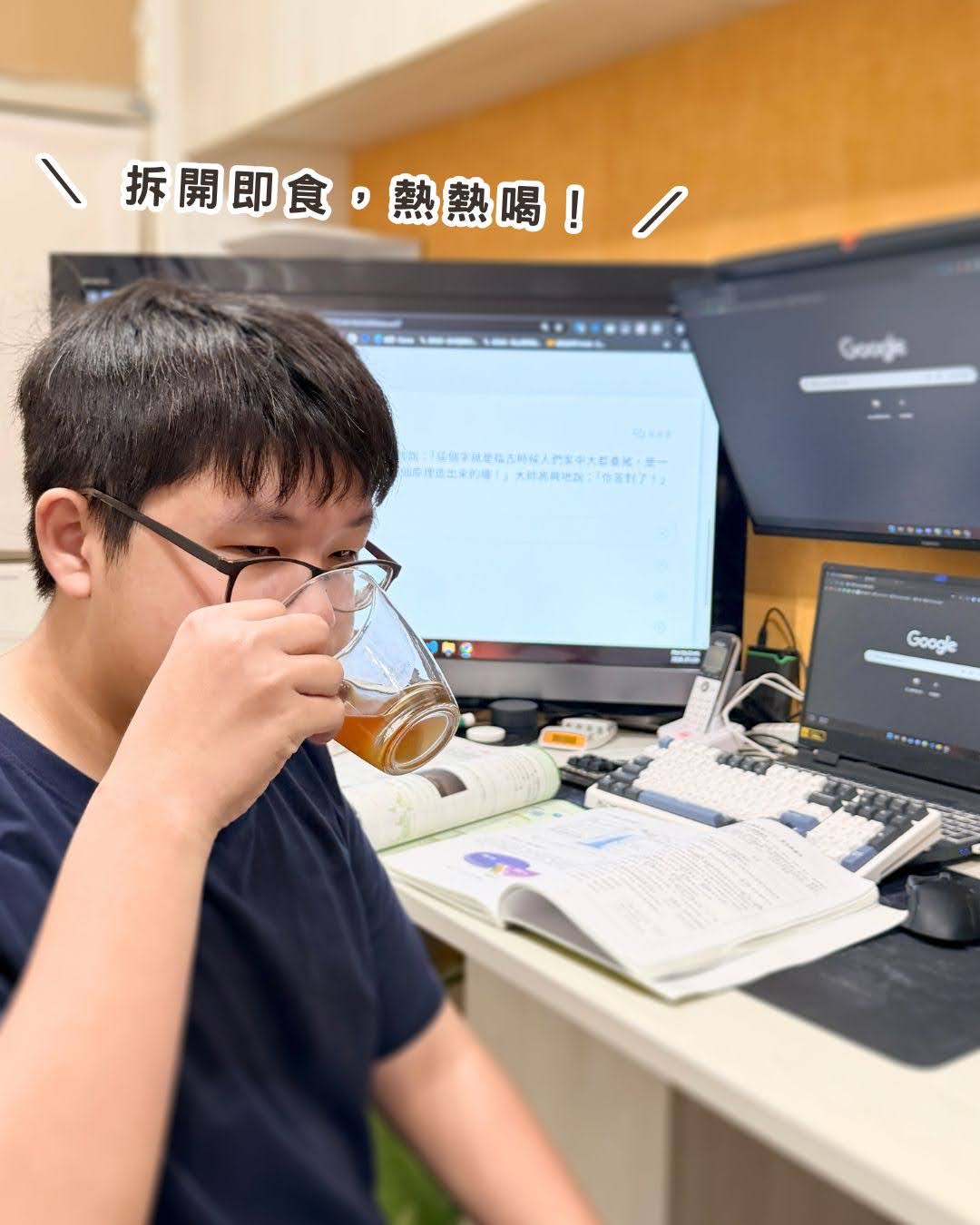 說到吃補,家裡最有心得的其實是大葛格。他大概是嫌棄在娘胎裡吃得不夠好,硬是提早幾個月出生,自己出來覓食(笑)。出生時只有兩千一百公克,還差點要住進保溫箱,從小我們在飲食營養上就特別用心,希望靠「食補」把他養壯養高。果然一路吃、一路補,現在長得又高又壯。前陣子他正值發育期,我還特地拜託外婆阿嬤幫忙準備大公雞補湯,可惜他對漢方調理不太捧場。